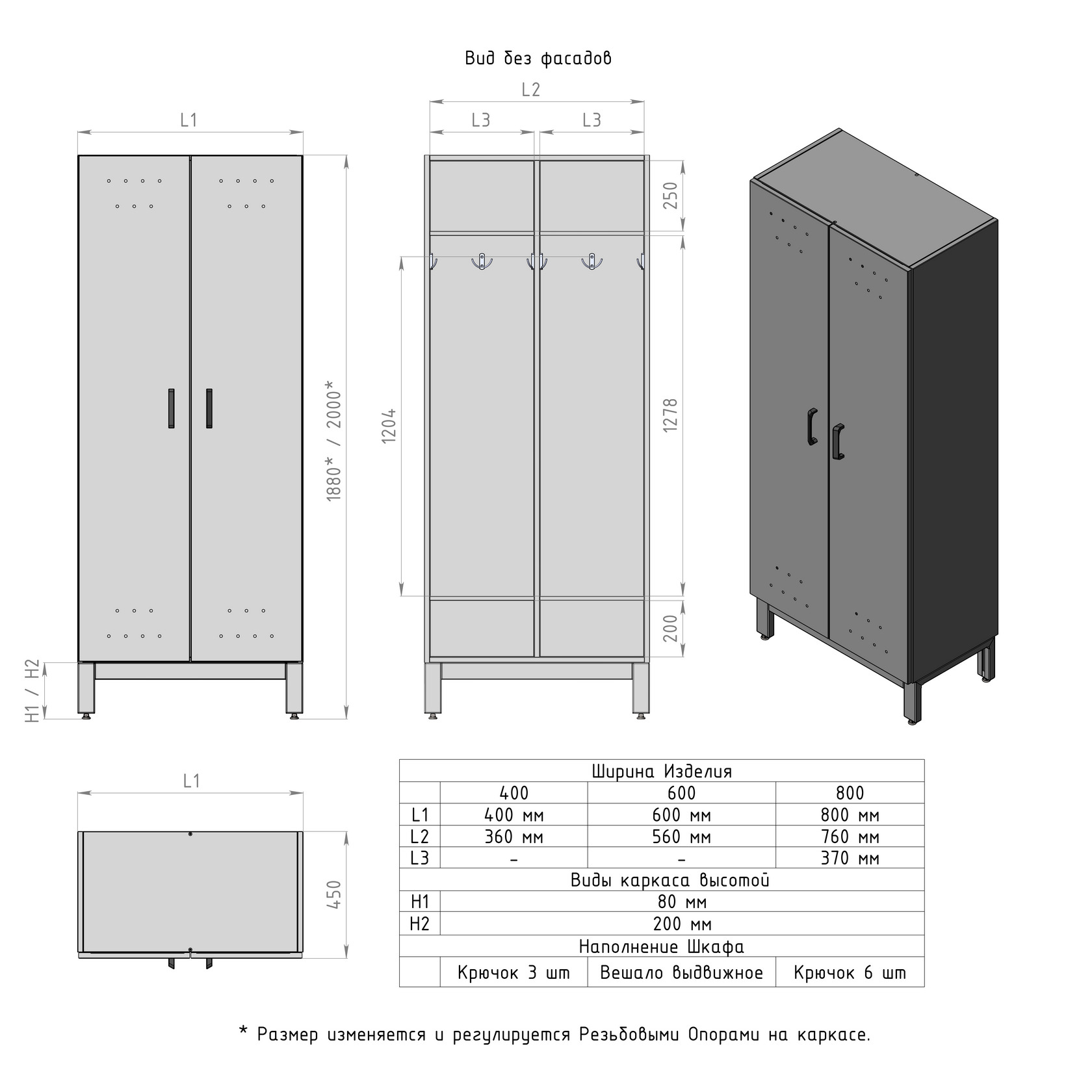 Шкаф шириной 800 мм имеет две дверки, полку и штангу для вешалок. Шкаф шириной 400 мм (только из ЛДСП) имеет одну дверку, полку и штангу для вешалок. Устанавливается на металлический сборно-разборный каркас с полимерным покрытием серого цвета. В каркасе предусмотрены регулируемые опоры в диапазоне 0-30 мм для компенсации неровностей пола. Шкаф из ЛДСП имеет одно общее отделение, шкаф из стали - два.