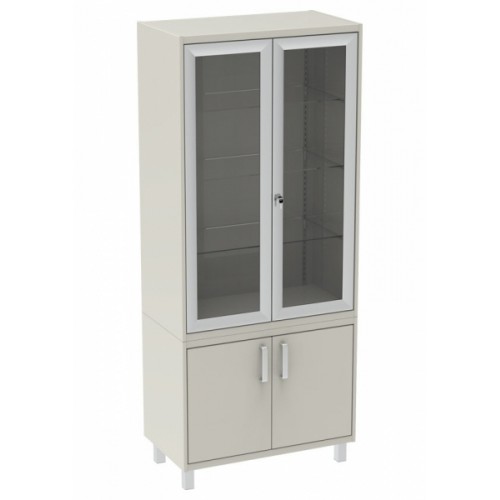 Фасады верхней секции шкафа изготовлены из алюминиевого профиля с заполнением из стекла, оснащёны замками. Нижняя секция имеет две двери из листовой стали, оснащены ручками. Внутреннее заполнение шкафа - 3 стеклянных полки и одна металлическая в нижней секции. Регулировка стеклянных полок по высоте осуществляется при помощи системы кронштейнов, которые позволяют оперативно регулировать расстояние между полками в широком диапазоне. Кронштейны оснащены силиконовыми держателями для стекла, предотвращающие свободное скольжение полок. Металлическая съёмная полка имеет одно положение.