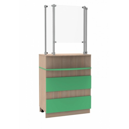 Прилавок аптечный. В стандартной комплектации изготавливается из ЛДСП 16мм типовых расцветок из "Каталога Декоров". Ограждение прилавка - стекло толщиной 5мм, смонтированого при помощи труб и крепежей системы JOKER. Со стороны персонала прилавок оснащён выдвижным ящиком на полновыкатных шариковых направляющих, а также двумя полками, закрытыми глухими фасадами. Прилавок установливается на регулируемую пластиковую опору высотой 100мм.