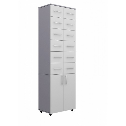 Шкаф сочетает в себе рациональность конструкции и надежность эксплуатации. В конструкции предусмотрены 12 выдвижных ящиков и отделение с полками, закрываемое дверцами. Расстояние между полками: 330 мм.