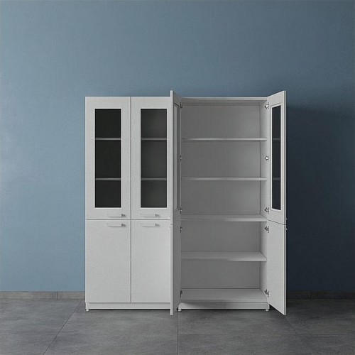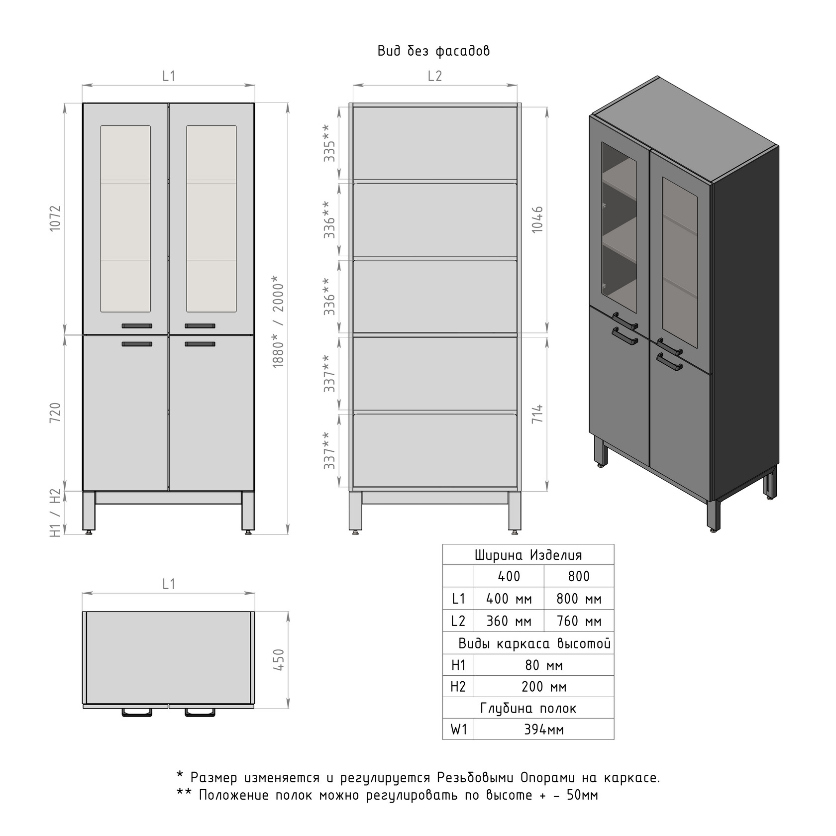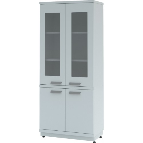 Шкаф шириной 800 мм имеет четыре распашные дверки (верхние - из стекла) и четыре полки.